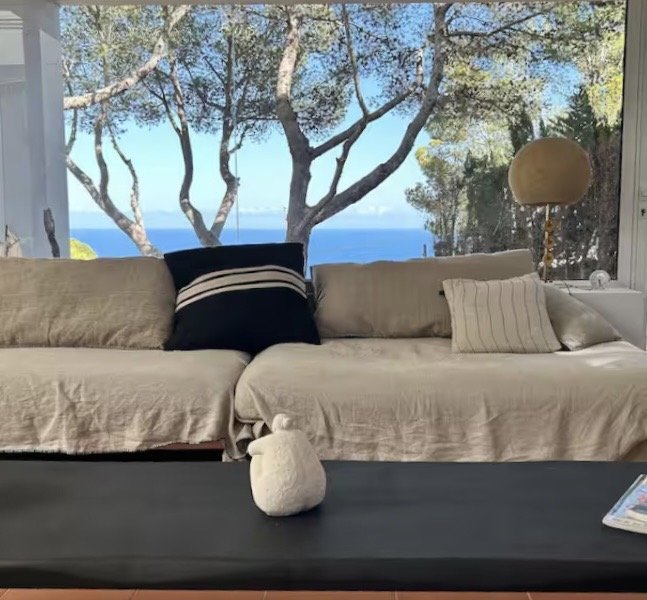 Un salon avec 2 très grands canapés pouvant accueillir tout le monde , une télé connectée et une belle vue mer